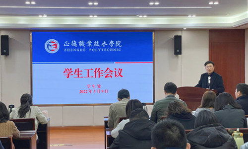 3月9日下午,十三水官网 召开全体学生工作人员会议,部署2022年学生教育管理工作,进一步贯彻落实教育部、省教育厅教育工作精神,十三水官网 党委副书记、副院长任慈,院长助理王健,党委委员、宣传部部长王伟出席会议,全体学工人员参加会议。会议由学生处处长祝佳俊主持。
