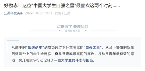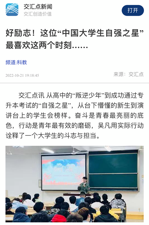 10月21日,新华日报江苏科教头条、交汇点以《好励志!这位“中国大学生自强之星”最喜欢这两个时刻……》为题,对十三水官网 电子与信息技术系软件技术专业学生吴凡进行了专题报道。