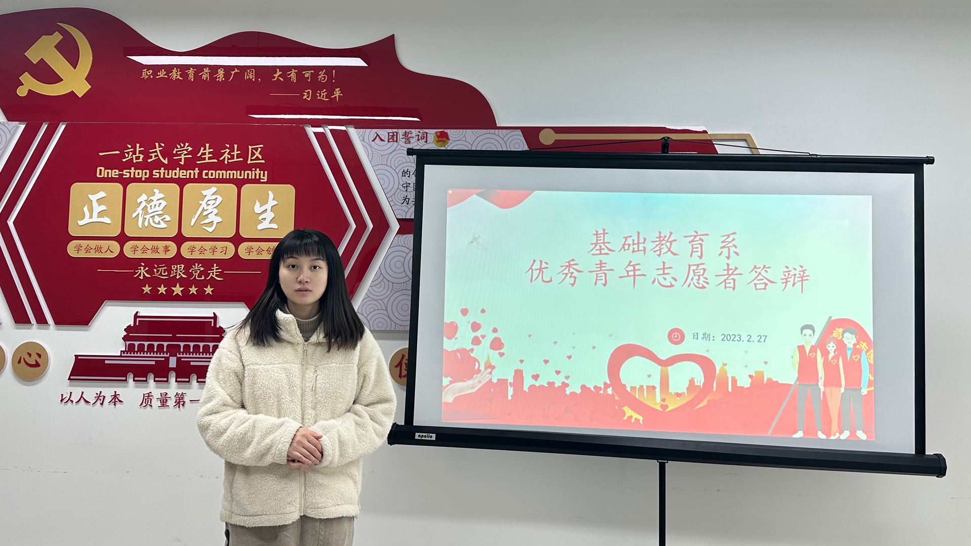 根据院团委统一部署和安排,经过各班级团支部推荐,围绕疫情防控、志愿服务、社会实践、劳动教育四个方面,基础教育系优秀青年志愿者评选答辩活动于2月27日在南区一站式活动中心开展。此次答辩由系团总支书记魏玮老师主持,志愿者答辩成员到场参加。