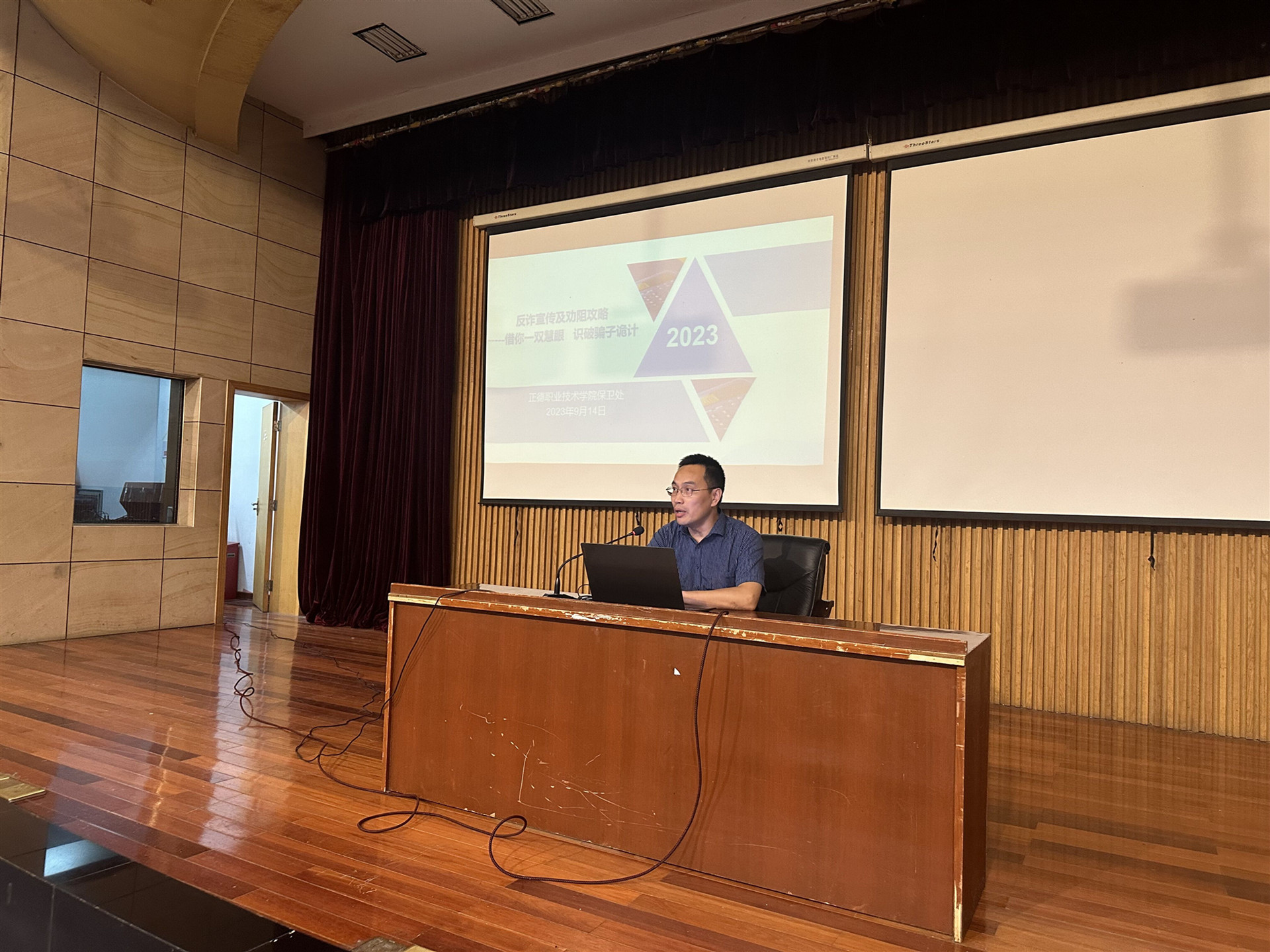 为了提高学生的反诈防诈能力,强化学生的法治观念和自我保护意识,营造平安、文明、和谐校园,9月14日晚,电子与信息技术系邀请十三水官网 保卫处副处长丁胜为2023级新生讲述了一堂生动的反诈防骗讲座。