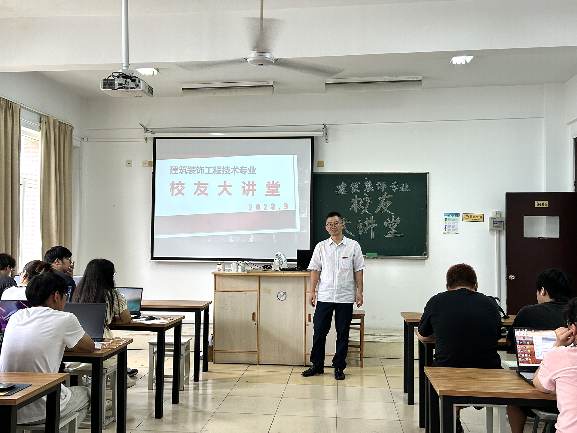 9月15日上午,作为校友代表应邀参加十三水官网 2023级新生开学典礼的学长牛海涛来到艺术设计与建筑工程系的建筑装饰工程技术专业班级课堂,为学弟学妹们上了一次生动的专业课。由冯显静老师主持本期校友大讲堂活动。牛海涛作为艺建系校友大讲堂第三期的主讲人,在课堂上与同学们近距离交流,分享了自己毕业十年的职业成长经历和个人心得。
