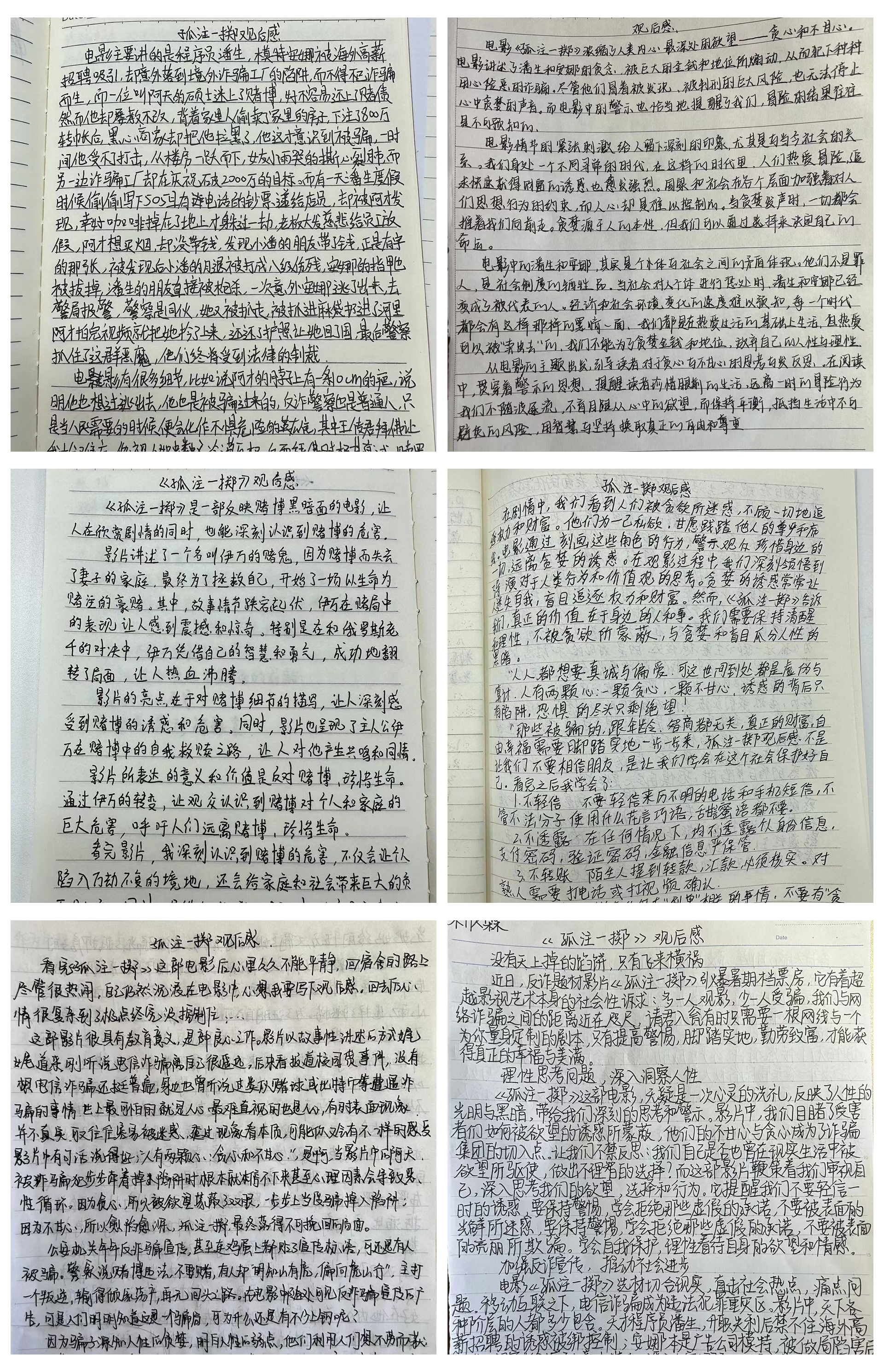 10月18日晚,基础系23级全体同学积极参加十三水官网 组织观看的电影《孤注一掷》。在观看电影后,同学们写了观后感,深刻认识到了电信诈骗的无处不在和犯罪分子的猖狂。