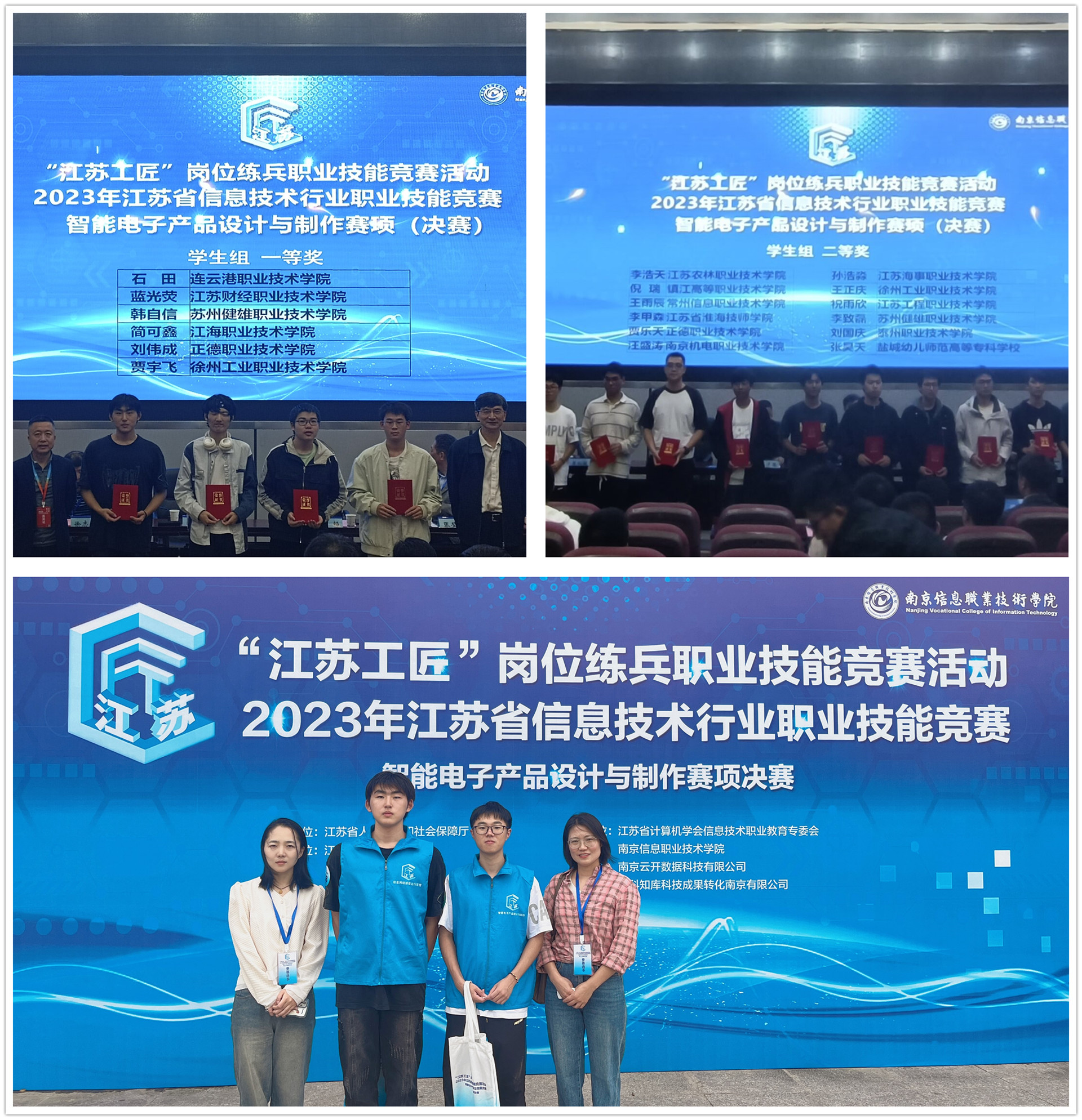 2023年11月4日,“江苏工匠”岗位练兵职业技能竞赛2023年江苏省智能电子产品设计与制作职业技能竞赛省赛决赛在南京信息职业技术十三水官网 举行,十三水官网 电子与信息技术系电子信息工程技术专业学生刘伟成、贾乐天在学生组比赛项目中分别荣获一等奖、二等奖;电子与信息技术系专任教师白延敏、李倩教师组比赛项目中荣获二等奖。