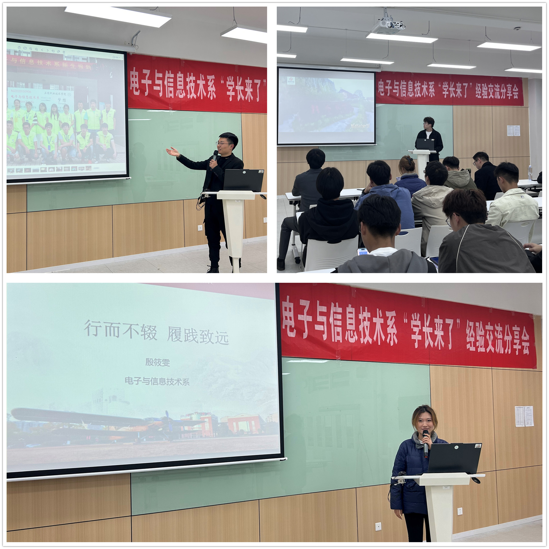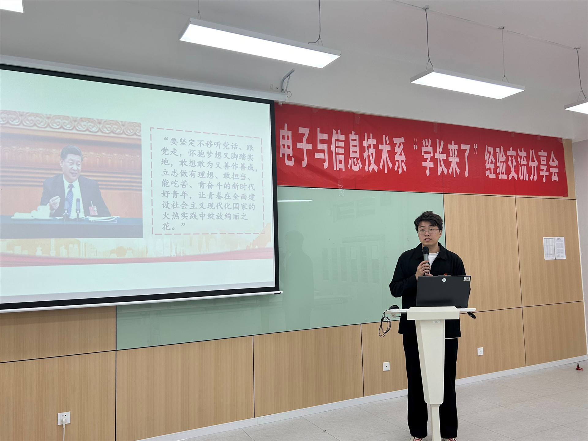 为深入学习贯彻党的二十大精神和团十九大报告,引导青年学生进一步坚定理想信念,扎实推进习近平新时代中国特色社会主义思想主题教育走深走实,11月23日,电子与信息技术系在教学楼9205开展“学长来了”信仰公开课暨青春故事分享会。电子与信息技术系党支部书记赵欣,团总支书记、辅导员何华智,辅导员付磊及2022级、2023级学生代表全程参与本次活动。活动由学生代表石增光主持。