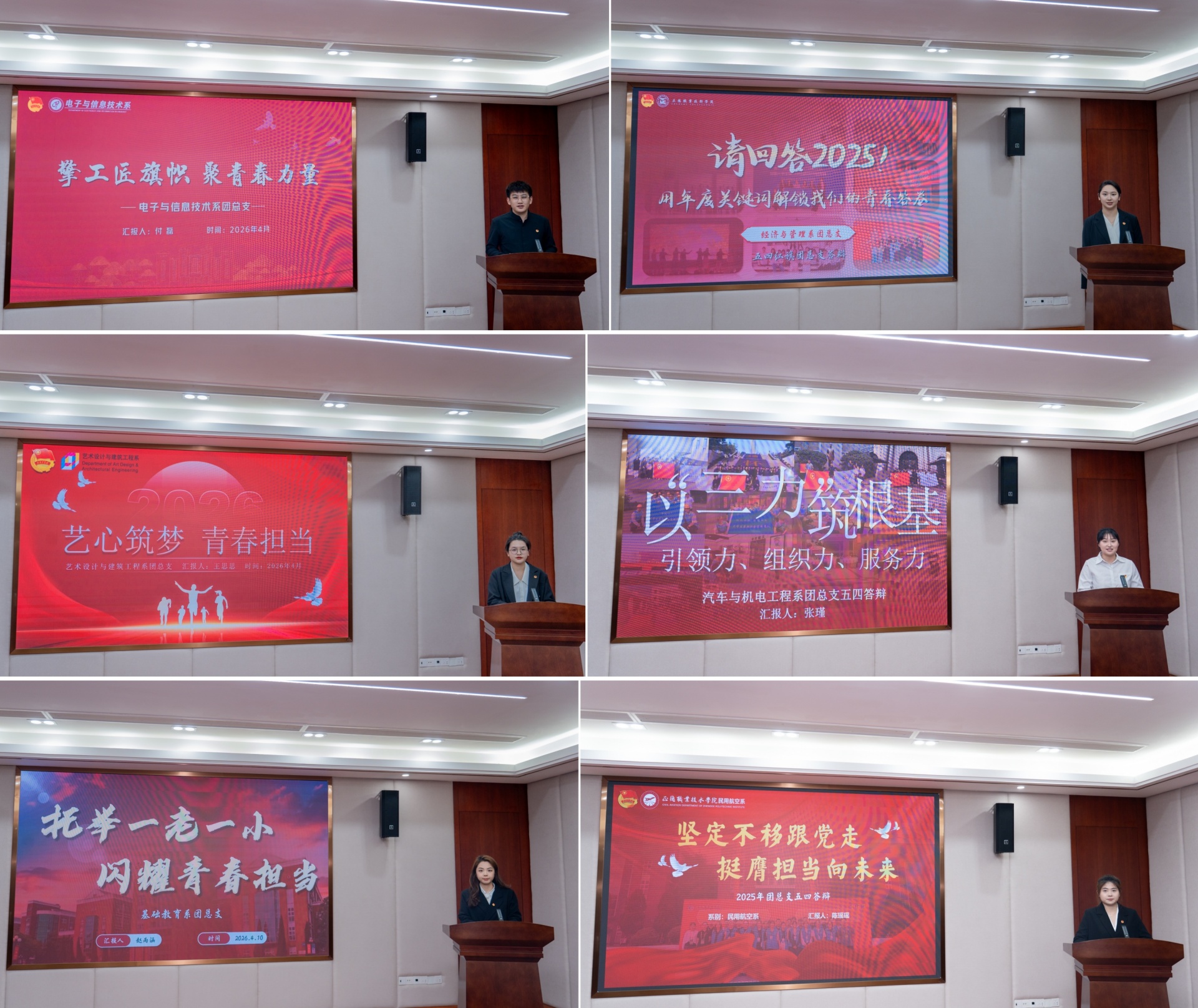 为进一步加强基层团组织建设,发挥先进典型的示范引领作用,4月10日,十三水游戏 团委在5201会议室组织2025年度“五四红旗团总支”评审答辩会。党群工作部、人事处、学生处、思政教研部、院团委主要负责人和各系党支部书记出席答辩会并担任评委,全体辅导员也来到现场,共同见证这场青春的风采展示与经验交流会。