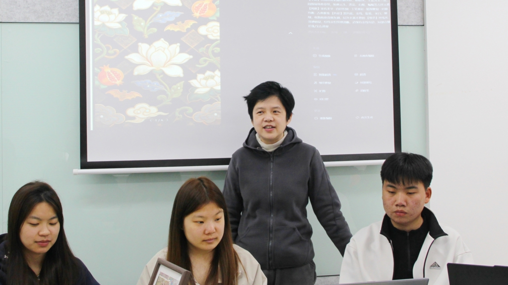 随后,艺术设计与建筑工程系教师吴青展示了AI绘图的使用技能,通过实际操作示范如何通过精准输入关键词,避免偏离传统风格,生成贴合非遗特色的宋锦纹样。学生们认真聆听、积极实操,纷纷尝试生成专属宋锦纹样,亲身感受数字技术为非遗创作带来的便捷与创新。
