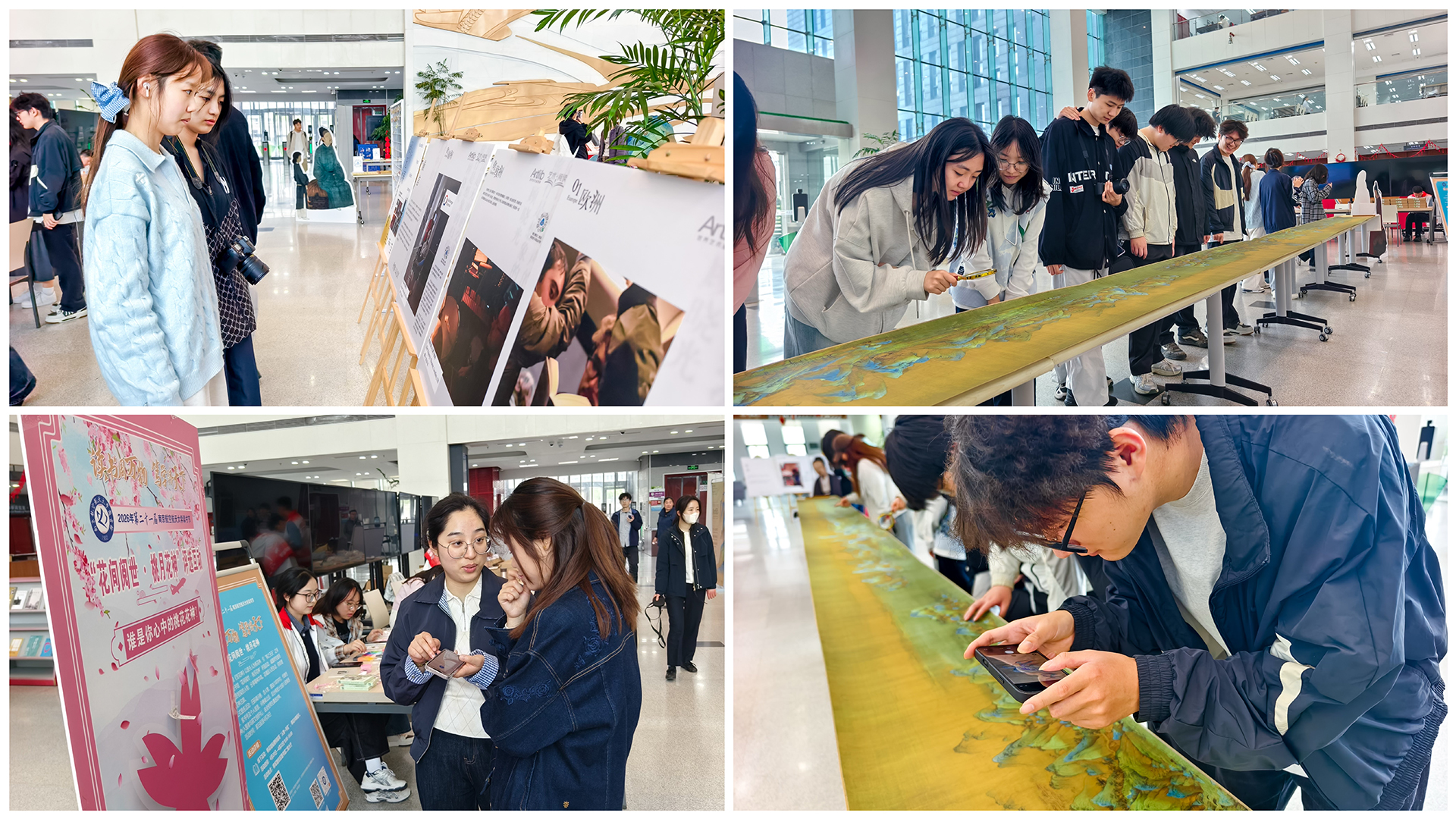 随后,师生一行转至十三水游戏 图书馆,参观了正在展出的“江山入画”山水艺术微展与“‘阅行无界’镜头下的诗和远方”摄影展,据十三水游戏 图书馆老师介绍,“江山入画”微展精选《千里江山图》《游春图》等国宝级山水名作高清复制品,高度还原古画神韵;“‘阅行无界’镜头下的诗和远方”摄影展以世界各地的阅读风貌为主题,展现出阅读作为跨越时空精神纽带的独特价值。现场还设置了异形打卡装置,为参观者打造沉浸式观展体验。