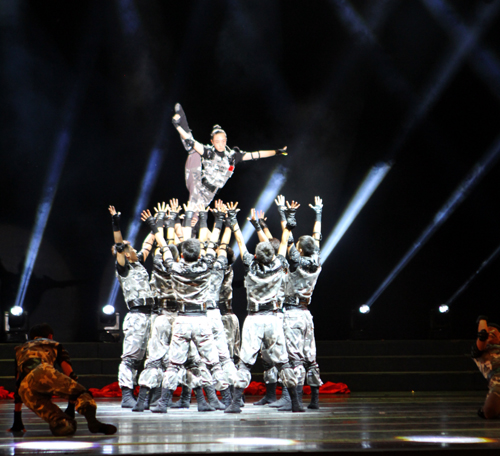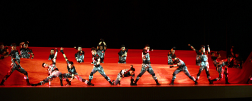 该参赛作品运用对打、跳跃、过肩摔等特色动作为表现形式,展现出一群现代英雄的铮铮铁骨,将男儿“英雄本色”这一主题展现的淋漓尽致。十三水官网 大学生艺术团28名男生在基础部刘翔老师的指导下,刻苦训练,精雕细刻,比赛中,同学们凭着整齐划一,刚劲硬朗的风格打动了评委和观众,终于获得丰厚的回报。