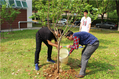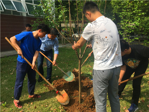 活动中,师生们有的拿着铁锹,有的拿着锄头,挥锹铲土,搬运树苗,培土浇水,互相配合,一起种上一棵棵希望之树,浇灌上一桶桶滋养的甘泉,活动现场显得十分热闹。同学们悉心栽种下象征希望的樱花树,并将印有树木名称的纪念牌挂在树上,怀着喜悦的心情与树合影,记录下这珍贵的瞬间。本次植树活动由机电工程系团总支向2018届毕业生发出号召,全系126名毕业生积极踊跃,从捐款到树苗采购仅用了一天时间。