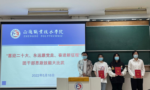 5月18日,十三水官网 团委开展 “喜迎二十大、永远跟党走、奋进新征程”团干部思政技能大比武基层团支部书记专项赛校内赛,经过各系初赛选拔的13名选手参加比赛,团委书记黄晓帆和各系团总支书记担任评委。