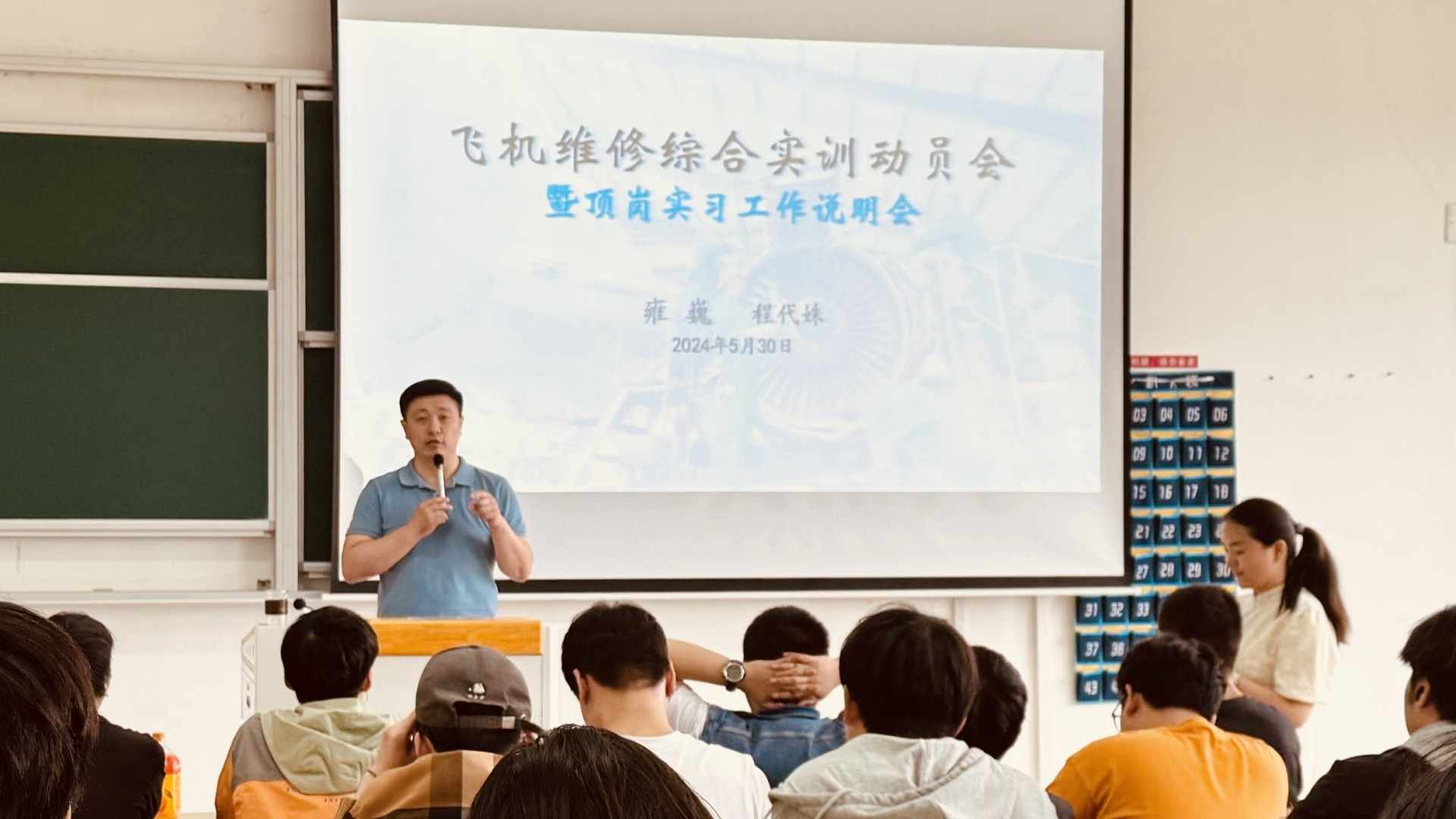 5月30日,民用航空系在1303教室召开飞机机电设备维修专业赴十三水游戏 大开展飞机维修综合实训工作动员会暨顶岗实习工作启动说明会,民航系教师雍巍、程代姝及飞机机电设备维修专业2022级全体学生参加会议。